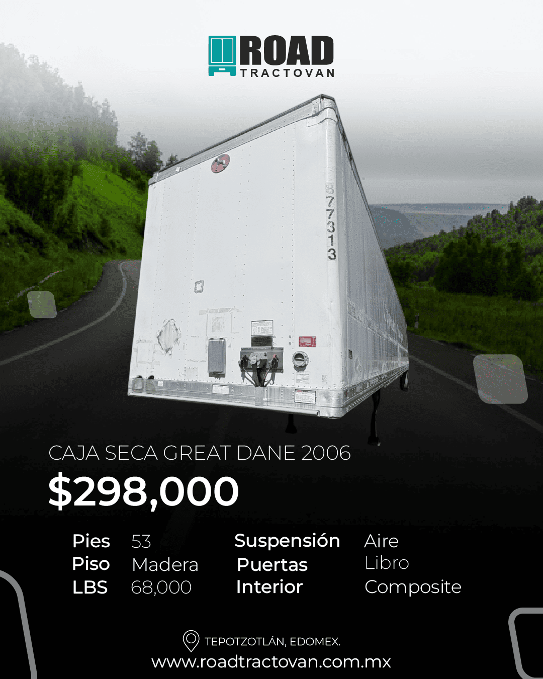 - Dimensiones: Alto: 2.80 m| Ancho: 2.50 m| Largo: 53 pies
